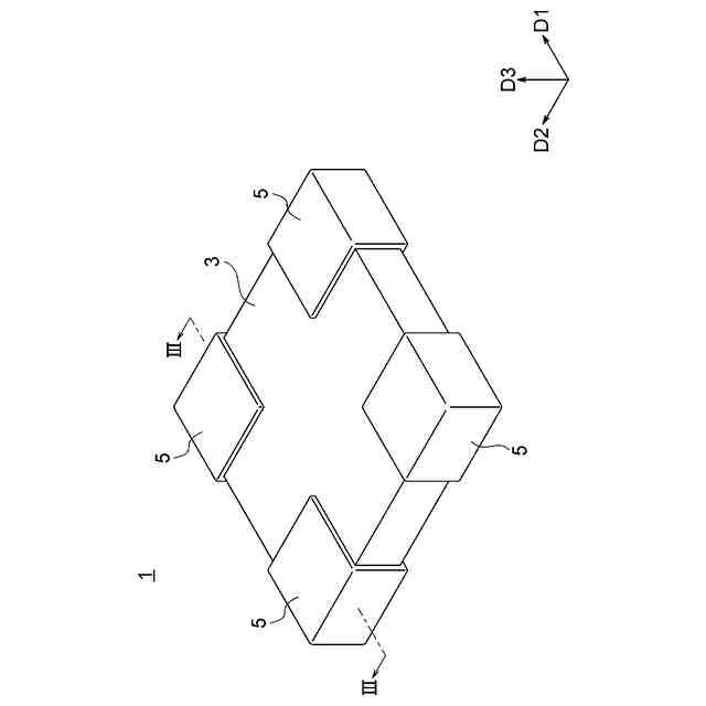 コンデンサ1は、例えば、積層セラミックコンデンサである。コンデンサ1は、概略直方体状の本体部3と、平面視において(D3方向に見て)本体部3の4隅に位置している4つの外部電極5とを有している。外部電極5は、コンデンサ1と他の電子部品(例えば不図示の回路基板)との電気的接続に寄与する。
