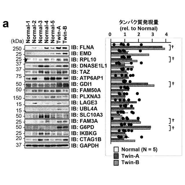 Filamin-Aは4R-tauの凝集を促進する。(a)剖検脳の前頭葉を用いたウエスタンブロット。Xq28のコピー数増加領域内の16のコード遺伝子のうち、5つの遺伝子(†;Filamin-A (FLNA)、RPL10、GDI1、FAM3A、G6PD)は、Twin-AとTwin-Bの両者が健常対照群(Normal-1~5)の中間値+標準偏差より高値であった。GAPDHをローディング・コントロールとして用いた。