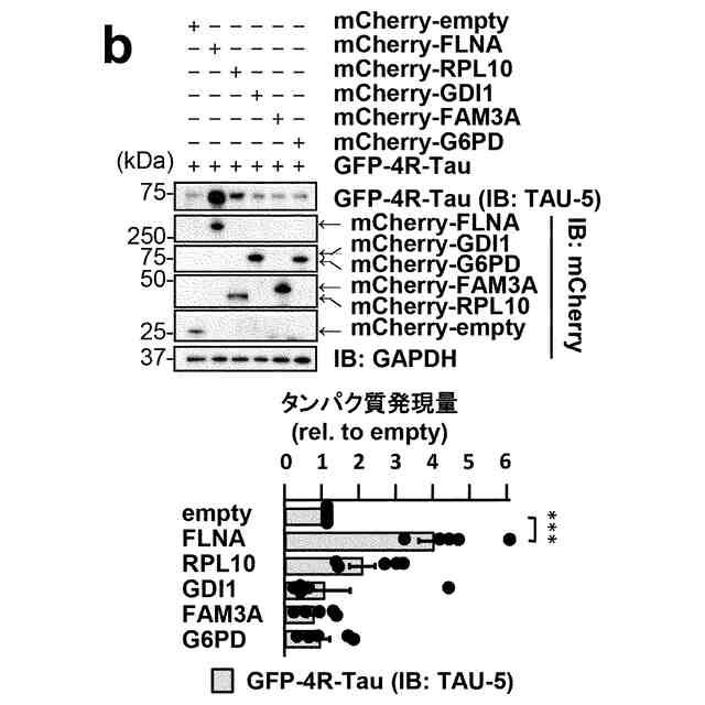 図3の続き。(b)前述の5つの遺伝子のうちFilamin-Aは、HEK293細胞にGFPタグ付きの4R-tau(GFP-4R-tau)と共発現させると、対照とするempty発現時と比較し統計的有意にGFP-4R-tauの発現量を増加した(P<0.001、n=5)。Tukey-Kramer検定を行った。***はP<0.001を示す。エラーバーは、標準誤差を示す。