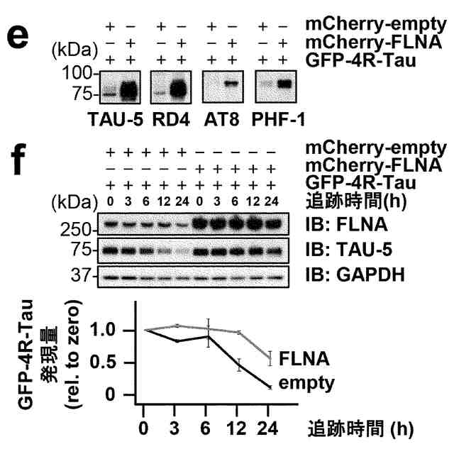 図3の続き。(e)Filamin-AとGFP-4R-tauを発現させたHEK293細胞から抽出したTBS可溶性画分(S1)のウエスタンブロット。リン酸化タウ抗体AT8(Ser202/Thr205)とPHF-1(Ser396/Ser404)を用いたところ、Filamin-A発現によりGFP-4R-tauのリン酸化亢進を認めた。(f)シクロヘキシミド(cycloheximide:CHX)追跡実験では、Filamin-A発現によりGFP-4R-tauの蛋白安定化を認めた(n=3)。Filamin-AとGFP-4R-tauを発現させたHEK293細胞にCHX投与し、図示した時間に蛋白を収集した(n=3)。