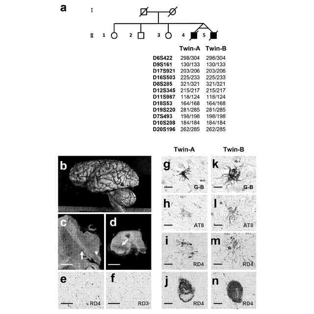 PSPを同時発症した日本人一卵性双生児ペア。(a)家系図は非発症者(白)とPSP発症の一卵性双生児(黒、Twin-A及びTwin-B)を示す。丸は女性、四角は男性を示す。マイクロサテライトマーカーのハプロタイプが12箇所全て完全に一致し、Twin-AとTwin-Bが一卵性双生児の関係であることに矛盾しない。(b~n)Twin-AとTwin-Bの神経病理所見はPSPに矛盾しない。Twin-Bの前頭葉は萎縮していた(b)。冠状断では、淡蒼球内節(c、矢印)と視床下核(c、矢じり)が萎縮していた。中脳では被蓋部が萎縮し、黒質は褐色調であった(d、矢印)。顕微鏡学的所見として、低倍率ではTwin-Bの淡蒼球において、4リピートタウ特異的抗体RD4陽性(e)かつ3リピートタウ特異的抗体RD3陽性(f)の凝集物を示す。Twin-A(g~j)とTwin-B(k~n)の高倍率を示す。PSPに特徴的なTA(g~i、k~m)とglobose-type NFT(j~n)を示す。スケールバーは、10 mm(c、d)、20 μm(e、f)、10 μm(g~n)。写真はGallyas-Braak(G-B)染色(g、k)、RD4抗体染色(e、i、j、m、n)、RD3抗体染色(f)、AT8抗体染色(h、l)を示す。