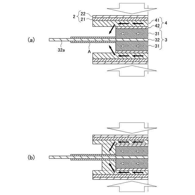 しかしながら、特許文献1に記載されている全固体電池の製造方法では、正極と、第1固体電解質層と、負極とをこの順に積層した状態で加圧する際に、正極活物質層の端部に第1固体電解質層が入り込み、第1固体電解質層が正極集電タブと密着する場合がある。このとき、さらに加圧すると、正極活物質層の端部が第1固体電解質層により拘束されるため、応力が集中して、正極活物質層および第1固体電解質層にクラックが発生する。その結果、全固体電池の容量が低下したり、耐久性が低下したりする。