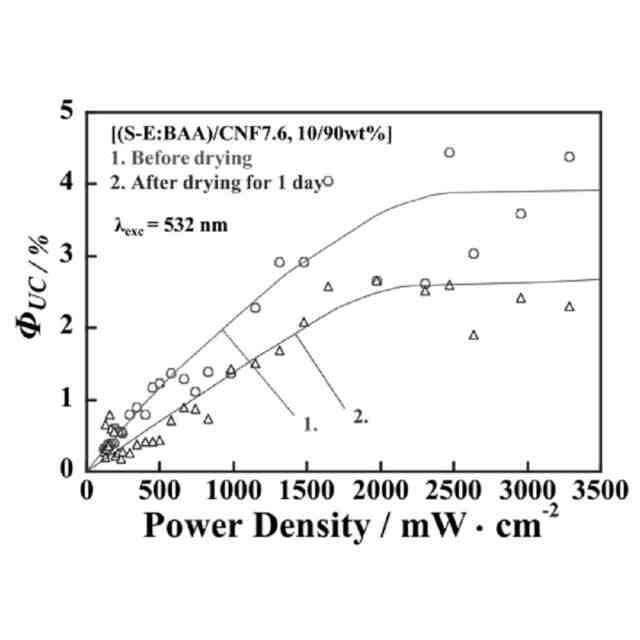 光アップコンバージョンの従来の方式としては、(1)強力なパルスレーザーを用いた二光子吸収、(2)非線形光学結晶とコヒーレント光源とを用いた第二高調波発生、(3)希土類元素の二段階励起を用いるものが挙げられる。これらの方式はコヒーレントな非常に強い入射光(レーザー)を必要とし、また、光アップコンバージョン効率は0.2%以下と非常に低い値であった。これらは、レーザーの波長変換光学素子などとして用いられているが、非常に強いコヒーレント光を必要とするため、有機太陽電池には利用できない。これに対して、近年では、二種類の光機能分子と三重項-三重項消滅(triplet-triplet annihilation(TTA))とを用いる方式が、入射光強度の低い非コヒーレント光に対し、1%以上の光アップコンバージョンを行える方法として注目を集めている。具体的には、長波長の光を吸収し効率的に三重項を生成する増感剤(sensitizer)と、増感剤から三重項間エネルギー移動(triplet-triplet energy transfer(TTET))で長寿命の励起三重項を生じ、さらにその励起三重項間衝突によって励起一重項を生成して蛍光を発する発光剤(emitter)という役割分担させた二種類の要素を組み合わせている。