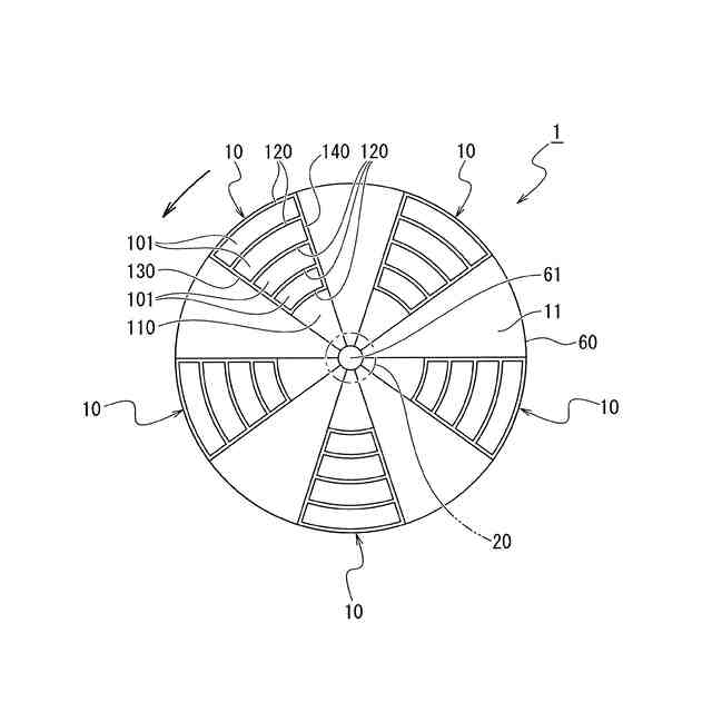 前記回転軸を中心とする円の径が異なる二つの同心円に沿う二つの円弧状の壁と、一対の側板と、を備え、前記円の径方向に複数形成されたものであり、