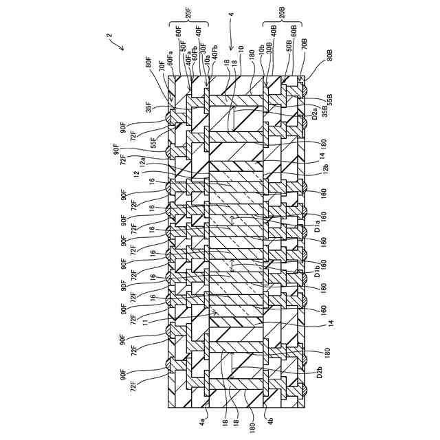 図1は実施形態の配線基板2を示す断面図である。図2と図3は実施形態の配線基板2の一部を示す拡大断面図である。図1に示されるように、配線基板2はコア基板4と第1ビルドアップ部20Fと第2ビルドアップ部20Bとソルダーレジスト層80F、80Bと接合部材90Fを有する。
