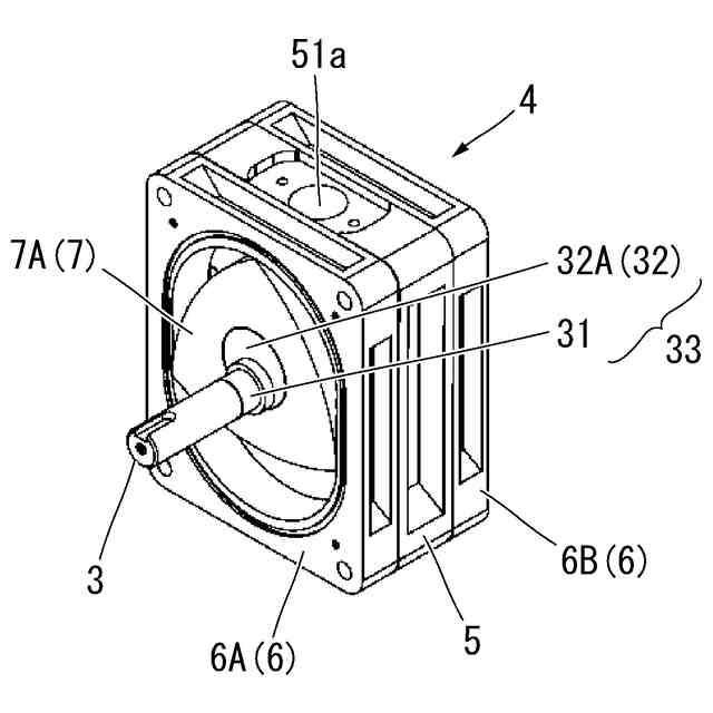 前記軸部を挿通させて端面が前記第1方向側および前記第2方向側を向くように配置され、側面と両端面それぞれとを連通する吸気路および排気路が形成されている吸気排気部と、