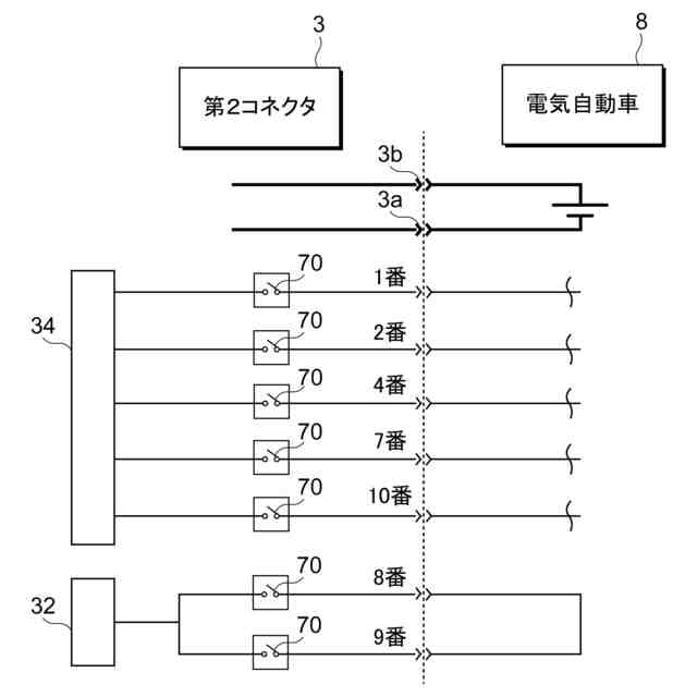 前記第2コネクタは、前記他の一の充電口に設けられた充電口側端子のうち、給電以外に用いられる充電口側端子に接続されるプラグ側端子につながる回路を備え、