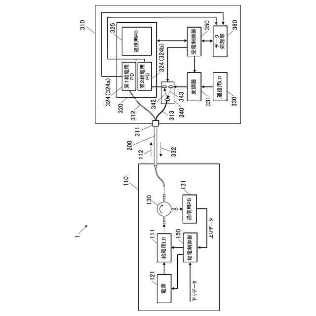 通信用PD131は、受電装置310から送信されてきて光サーキュレータ等の光デバイス130で分岐された信号光(レーザ光)332を、電気信号に変換する。この電気信号は、復調回路により復調され、信号光332に重畳されていた情報(上りデータ)が抽出されて、給電制御部150に送信される。