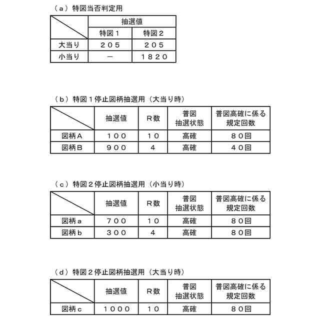 図8(a)は、特図当否判定用の抽選テーブルを模式的に示す図であり、図8(b)は、特図1に係る特図当否判定において大当りが導出された場合に用いられる停止図柄抽選用の抽選テーブルを模式的に示す図であり、図8(c)は、特図2に係る特図当否判定において小当りが導出された場合に用いられる停止図柄抽選用の抽選テーブルを模式的に示す図であり、図8(d)は、特図2に係る特図当否判定において大当りが導出された場合に用いられる停止図柄抽選用の抽選テーブルを模式的に示す図である。