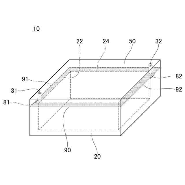 図1に示す実施形態のケース10は、車両に搭載されている。図示していないが、ケース10の内部には、電子回路(例えば、車両制御用の回路)が配置されている。ケース10は、箱体20と蓋50を有している。箱体20は、上部に開口22を有する容器であり、ほぼ直方体の形状を有している。蓋50は、箱体20の上部に配置されており、開口22を塞いでいる。蓋50は、図示しないネジによって箱体20に固定されている。箱体20の上端には、開口22の周囲に沿って伸びる外周縁部24が設けられている。外周縁部24は、開口22の周囲を環状に取り囲んでいる。図1において、ハッチングされた領域は、接着剤(例えば、FIPG: Formed In Place Gasket)を示している。外周縁部24には、その全周に亘って接着剤が設けられている。蓋50は、接着剤によって箱体20に接着されている。接着剤によって、蓋50と箱体20の界面がシールされている。このため、ケース10は密閉されている。