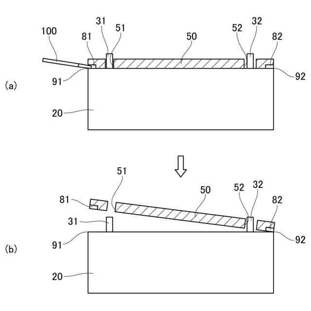 ケース10の側面には、箱体20と蓋50の境界90が現れている。境界90は、ケース10の形状に沿った四角形の形状を有している。境界90のうちの第1辺91には、第1切欠部81が設けられている。境界90のうちの第1辺91に対向する第2辺92には、第2切欠部82が設けられている。なお、図1では第2切欠部82が第1切欠部81に対して対角の位置に配置されているが、第2辺92上であれば第2切欠部82はどこに配置されていてもよい。図2、3に示すように、第1切欠81部及び第2切欠部82は、工具を挿入可能な凹部である。