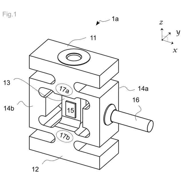 特許文献1に代表されるS字型ロードセルが公知である。そしてこの検出部周囲の枠形状部は力の伝達が主目的であって、力を伝達し薄肉となっている起歪部を撓ませて力を検出する。このためこの枠形状部は検出する力の大きさに対応した十分な剛性と強度が必要となるが、起歪部の梁の曲げひずみでは大きなひずみが発生することから、大きな荷重の検出に対応することと小型化の両立は難しい。そこで剪断歪みの検出で小型化を図ったロードセル(特許文献2)があるが、起歪部周囲の厚肉の枠部が起歪部に影響を及ぼすことや、感歪抵抗体を貼る向きの誤差により、検出精度において改善の余地があった。