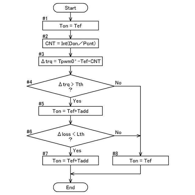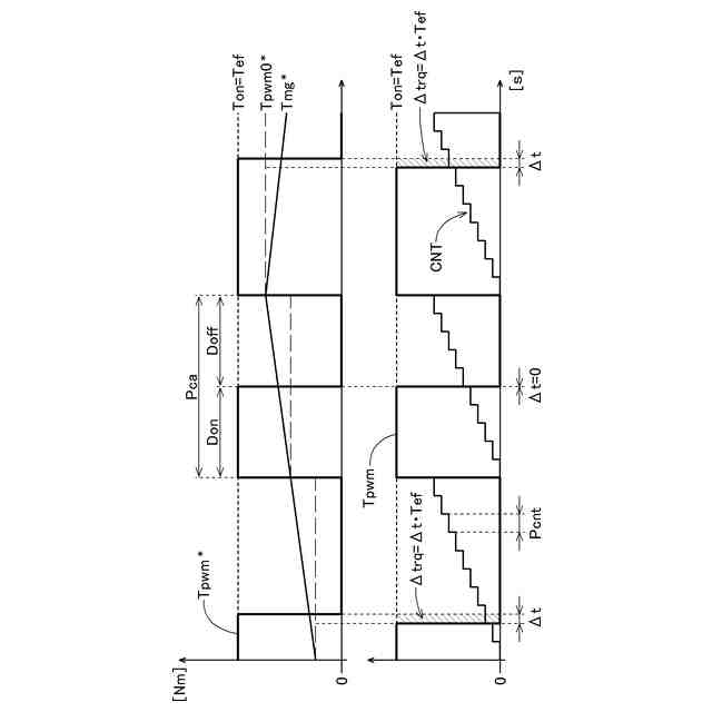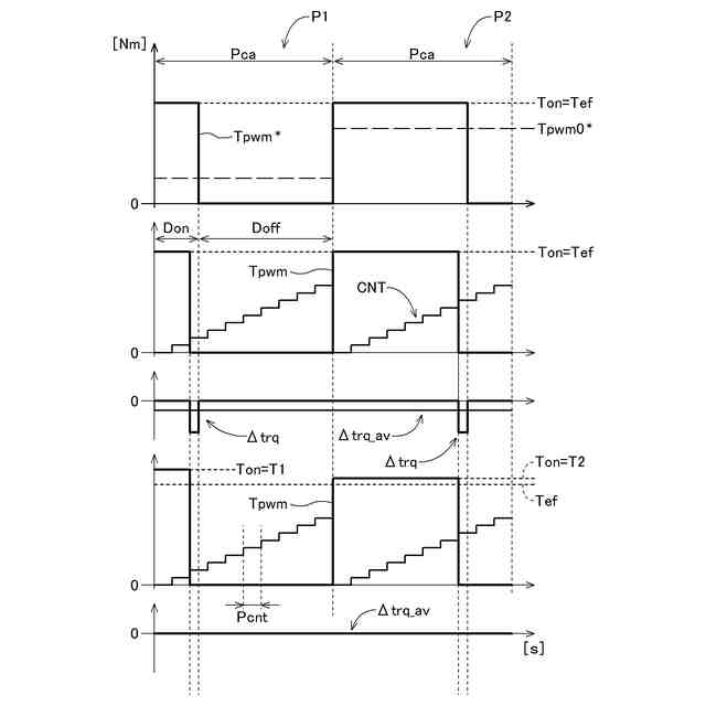 とトルク指令Tpwmの平均値とにトルクの誤差Δtrqが生じた場合には、トルクの誤差Δtrqを減少させる方向に、パルス幅変調波形がオン状態の時のトルク指令Tpwmの値Tonを調整する誤差補正処理をさらに実行する。