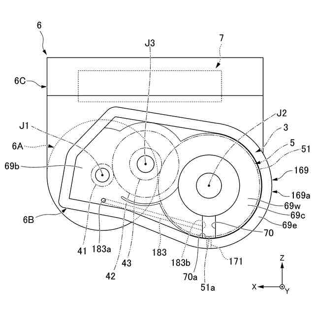 前記伝達機構は、前記第1軸線と平行な第3軸線を中心に回転可能であり前記第1ギヤ又は前記第2ギヤとかみ合う第3ギヤを有し、