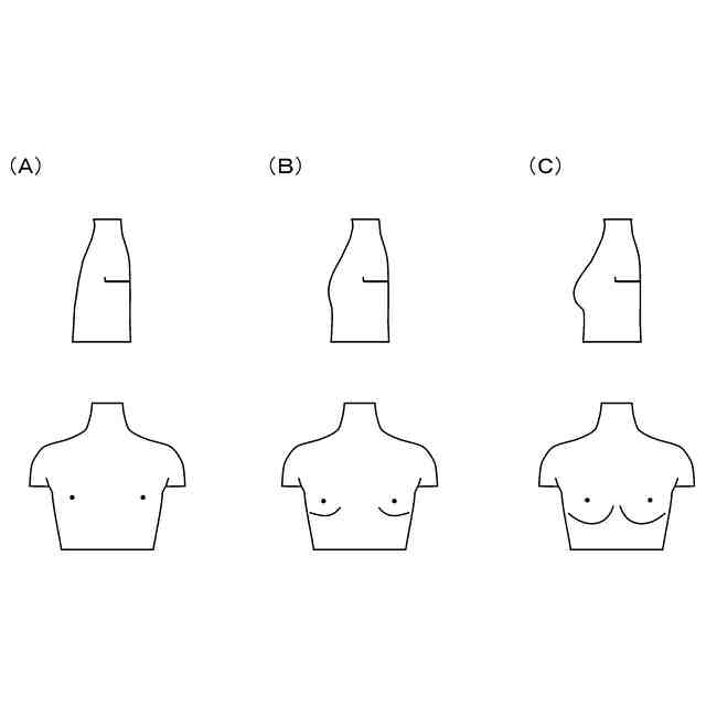 バストの成長過程において、バストが膨らむ前段階として、バストトップ周りが大きくなり始める。そして、この時期は、刺激で痛みを感じることもある。そのため、バストが全く膨らんでいない状態からバストトップが膨らみ始める段階においても、バストを保護する必要がある。図7に、バストの成長過程の図を示す。図7(A)は、バストの成長の第1ステップを示す図である。図示のように、バストは、バストトップ周りから大きくなり始める。次に、図7(B)は、バストの成長の第2ステップを示す図である。図示のように、第2ステップでは、バストのふくらみが横に広がり、バストの輪郭がわかるようになる。次に、図7(C)は、バストの成長の第3ステップを示す図である。図示のように、第3ステップになると、バスト全体が大きくなり、大人のバストに近づいていく。これまで、前記第1ステップから第3ステップの各段階を対象としたブラジャーは提供されている。しかし、着用者は、前記のどのステップのブラジャーを選択するかの判断で迷うことが多いものの、フィッティングに抵抗感を抱きやすい年齢でもある。また、成長期においてはバストを含む身体は日々成長するため、サイズの変化にも追随できることが求められている。