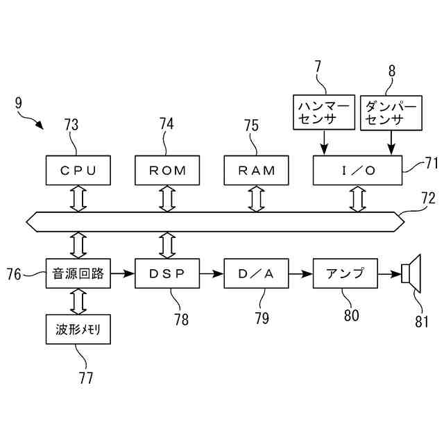 上記の複数のセンサは、ハンマーの回動速度を検出するハンマーセンサ、押鍵された鍵及びその下降速度を検出する鍵センサ、並びにダンパーペダルが踏み込まれたことを検出するダンパーペダルセンサなどを有している。上記の電子ピアノでは、演奏時に鍵が押鍵されると、制御部により、上記のハンマーセンサ、鍵センサ及びダンパーペダルセンサなどの検出結果に基づいて、所定処理が実行されるとともに、駆動信号が生成される。そして、生成された駆動信号が響板駆動ユニットに出力されることにより、押鍵された鍵に対応する楽音が発音される。