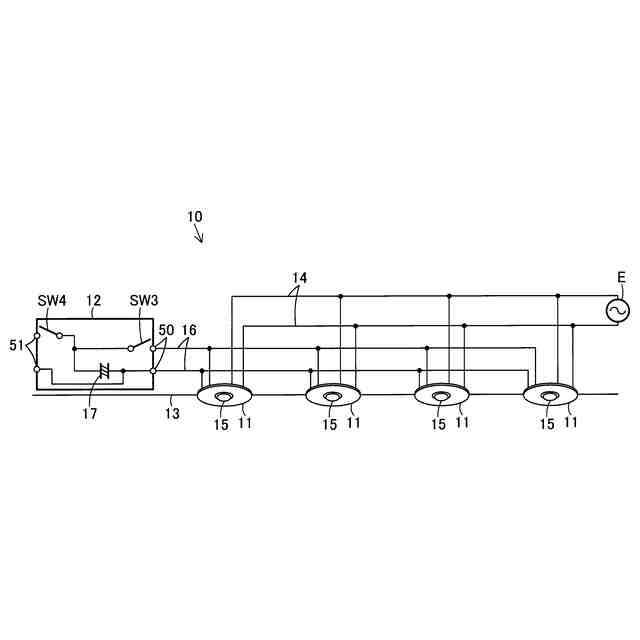図1に照明システム10を示す。照明システムは、複数の照明装置11と、照明装置11とは別体で、複数の照明装置11が接続されて共用される1つの負荷装置12とを備えている。各照明装置11は、被設置面である天井面13に設置され、負荷装置12は天井裏等に設置される。