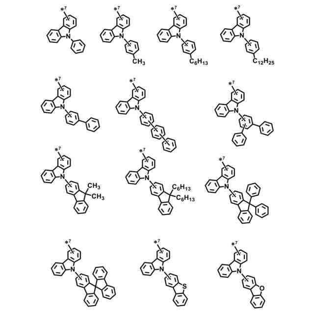 このうち、発光層の材料としては、蛍光発光材料、りん光発光材料がある。りん光発光材料は、蛍光発光材料と比較し、高い発光効率が見込まれる材料である。また、広い色域を網羅するために、RGB光源は半値幅の狭い発光スペクトルが要求される。特に青色は深い青が要求されるが、長寿命かつ色純度の観点を満足できる素子は見出されていないのが現状である。