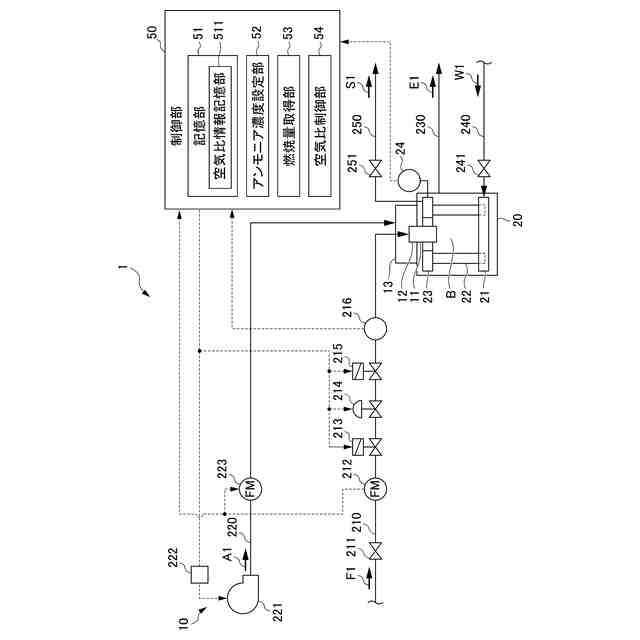 前記空気比情報記憶部は、前記燃焼量取得部が取得する前記燃焼量に対応する、前記アンモニア濃度と前記第1空気比との関係を記憶し、
