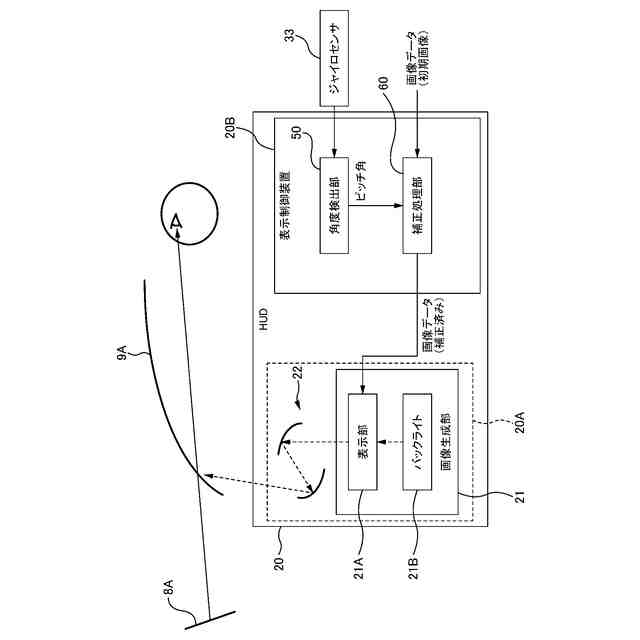 特許文献1には、ジャイロセンサの検出値に基づいて車両のピッチ方向の姿勢変化量を推定し、姿勢変化量に応じて虚像の表示位置を補正するヘッドアップディスプレイ装置が記載されている。また、特許文献1には、車両が勾配区間へ進入した場合に、勾配に起因するピッチ方向の姿勢変化量を勾配影響分として推定し、ジャイロセンサの検出値に基づくピッチ方向の姿勢変化量から勾配影響分を除いた姿勢変化量に基づいて、虚像の表示位置を補正することが記載されている。