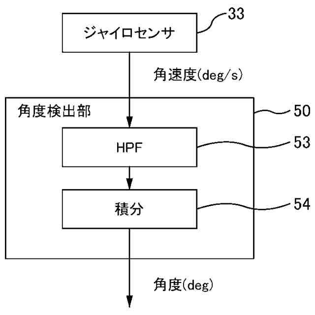 第1カットオフ周波数の第1ハイパスフィルタを通過した前記角速度信号を積分して第1角度を求める第1角度算出部と、