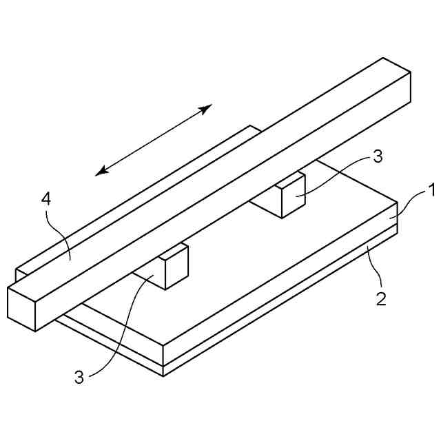 図9に示すように、この振動型アクチュエータの振動子は、矩形の板状に形成された金属材料から成る弾性体1を備え、弾性体1の裏面には圧電素子2が接合されている。弾性体1の上面の所定位置には、複数の突起部3が設けられている。この構成によれば、圧電素子2に交流電圧を印加することにより、弾性体1の長辺方向における2次の屈曲振動と、弾性体1の短辺方向における1次の屈曲振動とが同時に発生し、突起部3に楕円運動が励起される。そして、突起部3に被駆動体4を加圧接触させることにより、被駆動体4を突起部3の楕円運動によって直線的に駆動することができるようになっている。