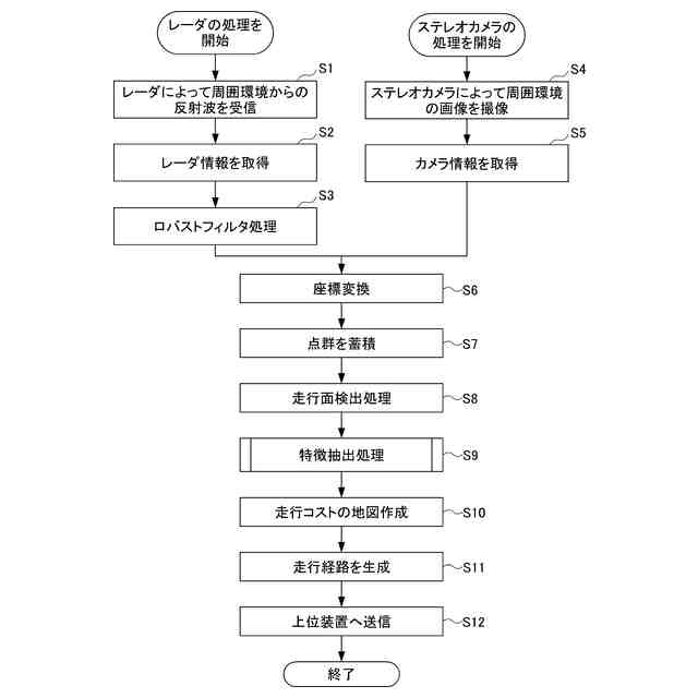 前記走行面の特徴は、段差、前記走行面の状態が変化する境界及び前記ステレオカメラの死角を含み、前記特徴検出部は、前記レーダ情報及び前記カメラ情報の少なくとも一方により算出された前記走行面の高さ情報に基づいて、前記分割領域ごとに段差を特定し、前記カメラ情報により算出された前記走行面の色情報に基づいて、前記走行面の状態が変化する境界を特定し、前記レーダ情報及び前記カメラ情報により算出された前記走行面の高さ情報に基づいて、前記分割領域ごとの点群の占有率を算出し、当該占有率に基づいて前記ステレオカメラの死角を特定してもよい。