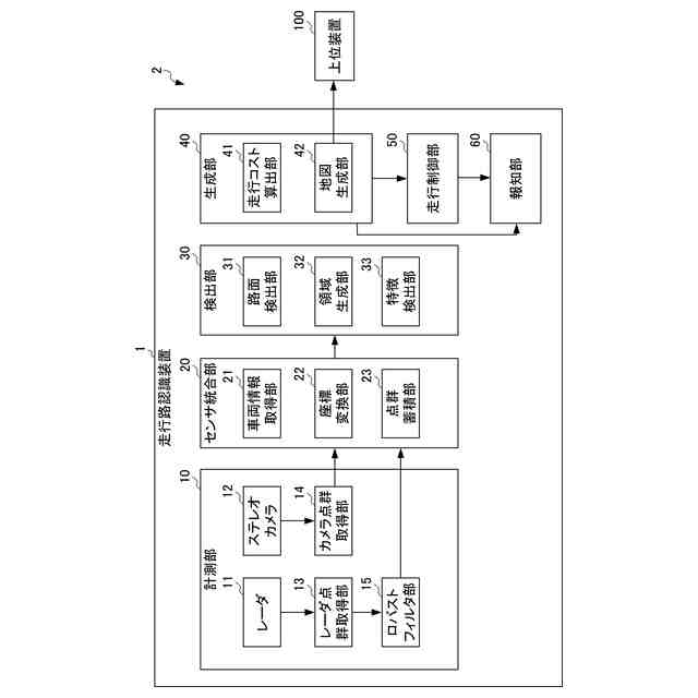 上記の、及び他の目的を達成するために、本発明に係る走行路認識装置は、レーダのアンテナの放射方向と、ステレオカメラの撮像方向が同一の方向を向くように移動体に配置されており、当該レーダにより検出されたレーダ情報と当該ステレオカメラにより撮像されたカメラ情報とを受信する受信部と、前記移動体が走行する走行路の走行面を仮想的に分割する処理を行う処理部と、前記受信部で受信された前記レーダ情報と前記カメラ情報とに基づいて、前記処理部によって分割された分割領域ごとに、前記走行面の特徴を特定する特徴検出部と、を備える。