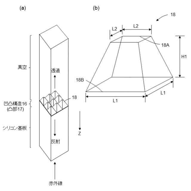 前記凹凸構造は複数の凹部または複数の凸部からなる複数の凹凸要素を有し、前記第1の基板と前記第2の基板が対向する方向からみて、前記凹凸要素の中心と当該凹凸要素に最も近接する凹凸要素の中心との間隔が8μm未満である、電磁波センサ。