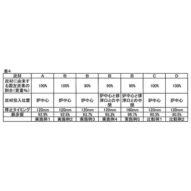 また、還元剤および加炭材としては一般炭やバイオマス炭が用いられる。これらの炭材には揮発分(VM)が含まれており、これらの炭材が投入されると炉内でガスが急速に発生し、溶鉄面が乱れる。そのため、未溶解の固体還元鉄がスラグ中に浮遊しやすくなる。そこで、炉内での溶鉄面の安定性を考慮しながら固体還元鉄の層をスラグとともに排出しないようにすることにより、鉄の歩留まりを向上させることができることを本発明者らは見出した。