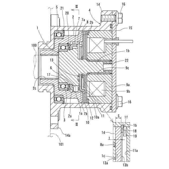 【解決手段】内方部材1と外方部材2間に保持する係合子6をこれら部材1、2に係合させる係合位置と当該係合を解除する解放位置との間を移動可能に配置された保持器7と、保持器7に回り止めされたセンタリングばね8と、電磁石9と、保持器7に対して回り止めされかつ軸方向に移動可能に配置された摩擦部材10と、電磁石9と摩擦部材10間で電磁石9に軸方向に対向するアーマチュア11を介して摩擦部材10を軸方向に電磁石9から遠ざかる方へ付勢する離反ばね12と、その付勢された摩擦部材10を軸方向に受けると共に保持器7を前記係合位置へ移動させるように摩擦部材10に周方向力を与える摩擦面部2bと、電磁石9の励磁時に摩擦部材10を摩擦面部2bから軸方向に離れた位置に弾性的に保持する弾性部材19とを備える。