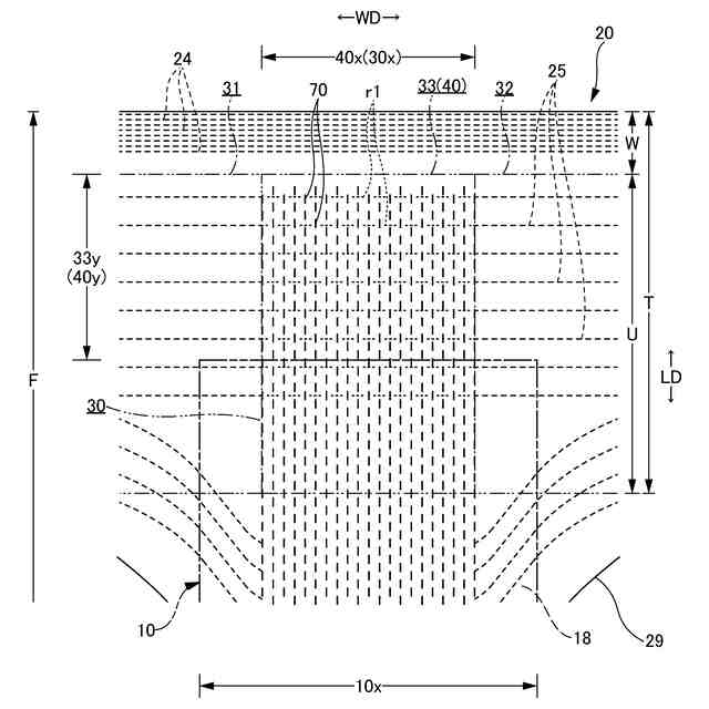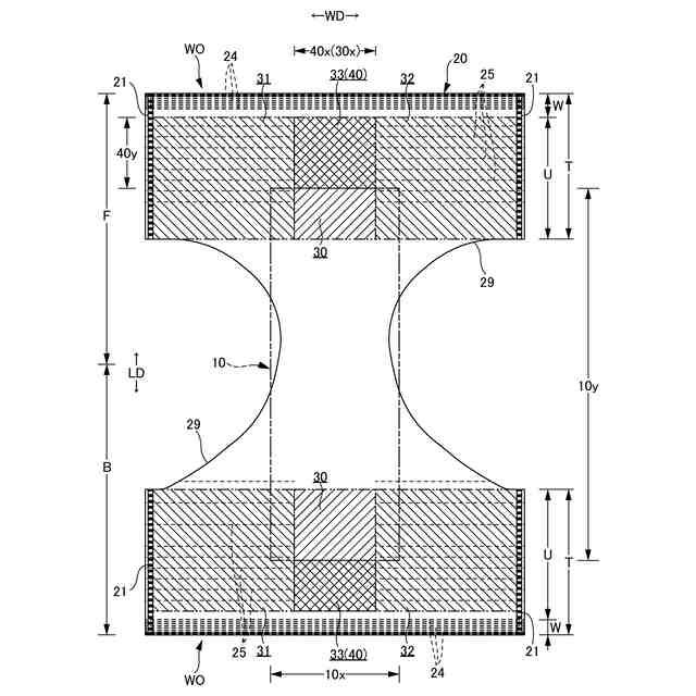 前記パッド固定領域は、前記第1領域の前記細長状弾性部材と前記第2領域の前記細長状弾性部材とを幅方向に沿って繋ぐ複数の仮想直線とそれぞれ交差するように形成された、前記内側シート層及び前記外側シート層の少なくとも一方を切断する複数の切断部を有し、