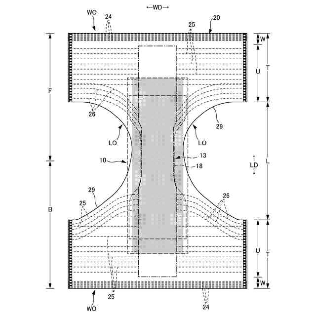 このようなパンツタイプ使い捨ておむつでは、身体へのフィット性を向上させるために、外装体に伸縮構造を設けることが一般的となっている。例えば、サイドシール部の間の領域として定まる胴領域や、前後の胴領域の間に位置する中間領域に、伸縮構造を設けたものは身体に対するフィット性が比較的に高いものとなっている(例えば特許文献1及び2参照)。