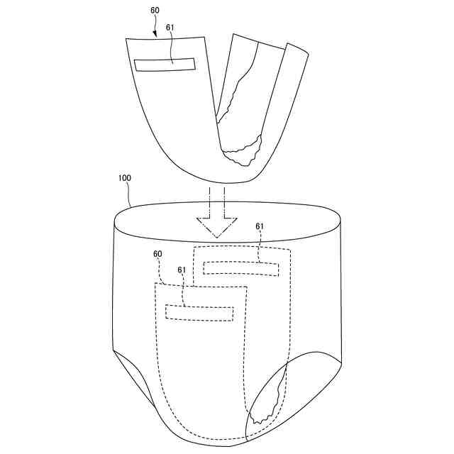 他方、パンツタイプ使い捨ておむつでは、内面に使い捨て吸収パッドを併用することがある。このような使い捨て吸収パッドの多くは、裏面における少なくとも前端部及び後端部に、パンツタイプ使い捨ておむつの内面に対する固定手段(ズレ止め)として、メカニカルファスナーのフック材や粘着剤を有している。