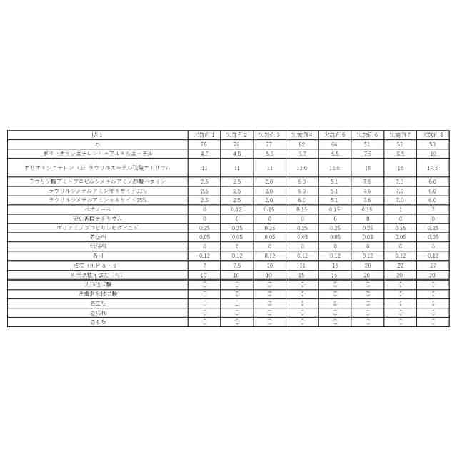 組成例:水84質量部、ポリ(オキシエチレン)=アルキルエーテル7.5質量部、ポリオキシエチレン(3)ラウリルエーテル硫酸ナトリウム3.7質量部、ラウリン酸アミドプロピルジメチルアミノ酢酸ベタイン1.2質量部、ラウリルジメチルアミンオキサイド3.9質量部、防腐剤としての安息香酸ナトリウム0.035質量部、防腐剤としてのポリアミノプロピリレビグアニド0.05質量部、ペオノール0.001質量部、着色剤0.2質量部、香料0.1質量部。