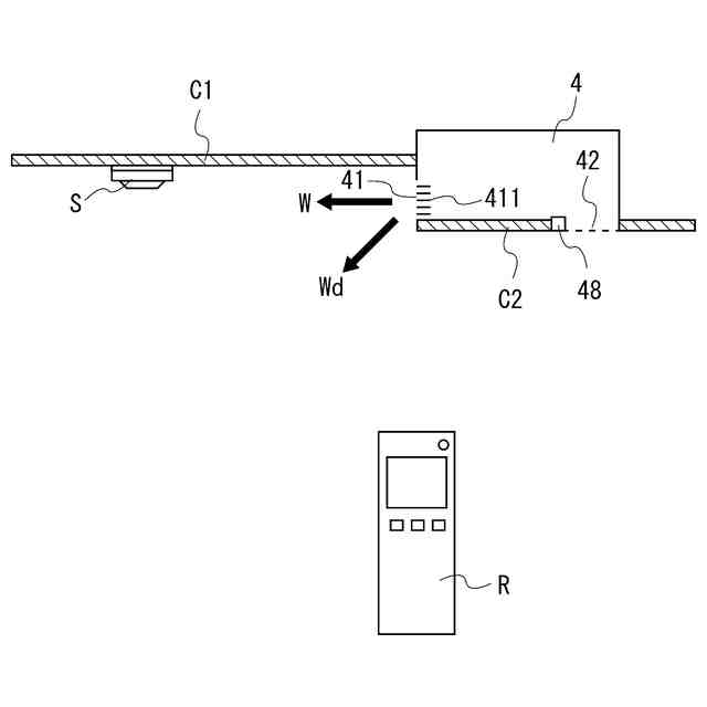 実施例1のエアーコンディショナーは、室外機(図示せず)と、図1に記載された室内機1とを有し、室内機1から冷風と温風を送風可能である。図1は、天井に設置された実施例1におけるエアーコンディショナーの室内機1の縦断面図である。室内機1と天井板C1、C2は断面で記載し、火災感知器Sは側面を記載している。図1の室内機1は、熱交換器や送風ファン等の内部構成の一部について記載を省略している。また、図1では、エアーコンディショナーを赤外線でコントロールするリモートコントローラーRをイメージ的に記載している。