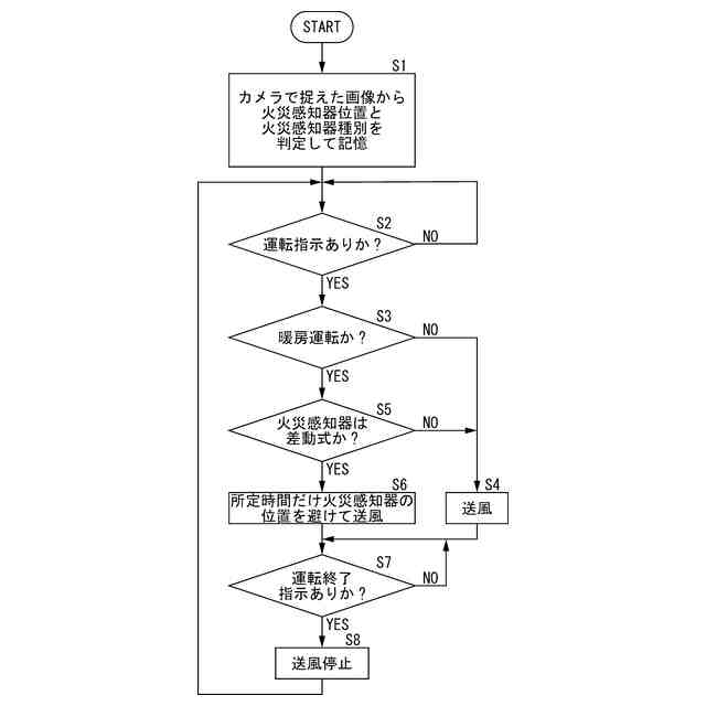 本発明の一実施形態におけるエアーコンディショナーは、風向制御装置と、メモリーとを備え、前記メモリーに火災感知器位置を記憶し、送風する際に、前記風向制御装置により前記火災感知器位置を避けて送風することを特徴とする。
