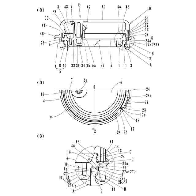 本発明の実施例であるキャップ付き容器を示す図であり、(a)は閉蓋状態の側断面図、(b)はキャップ本体の一部上面図、(c)は(a)の要部拡大図である。
