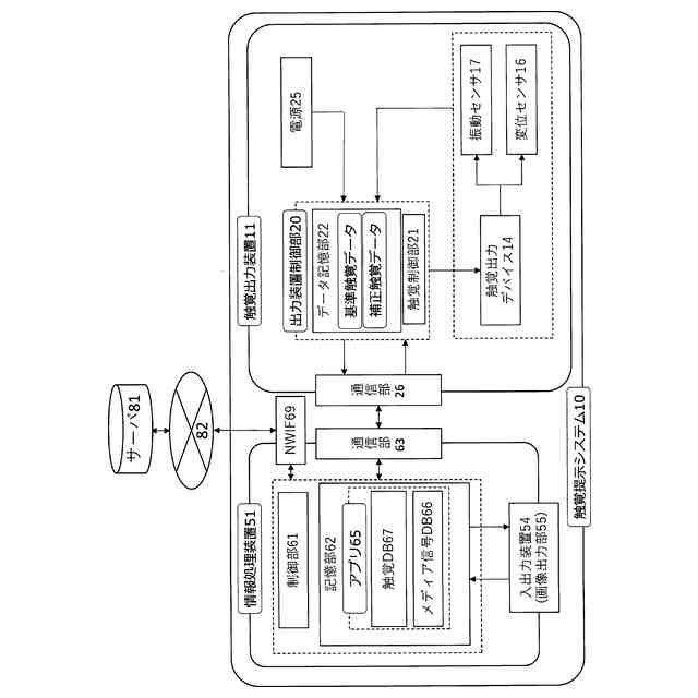 触覚出力デバイス14とそれに対するユーザの操作部の動きを測定する振動センサ17とを有する触覚出力装置11を有し、触覚出力装置11へ、基準触覚に対応し、触覚を増減する波形データを含む基準触覚データを送信する初期送信手段と、基準触覚データを提示させたときに発現する変化する実触覚を振動センサ17により測定する測定手段と、基準触覚と測定された実触覚を比較する比較手段と、比較手段の結果に基づき、触覚データに含まれる波形データを補正した補正波形データを取得する補正手段と、触覚出力装置11へ、補正波形データを送信する補正後送信手段と、を実行するようにする。