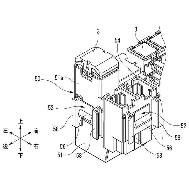 そこで、これら電線5が接続体550の下方を通過してロック構造560に被るため、フレーム530の下部開口からのロックアーム552の目視が困難となったり、検知治具70をアーム撓み空間に挿入するスペースが確保できなくなったりし、ロック構造560の半嵌合確認が困難となる。その結果、フレームの嵌合保持部に接続体を確実に組付けることができないという問題があった。