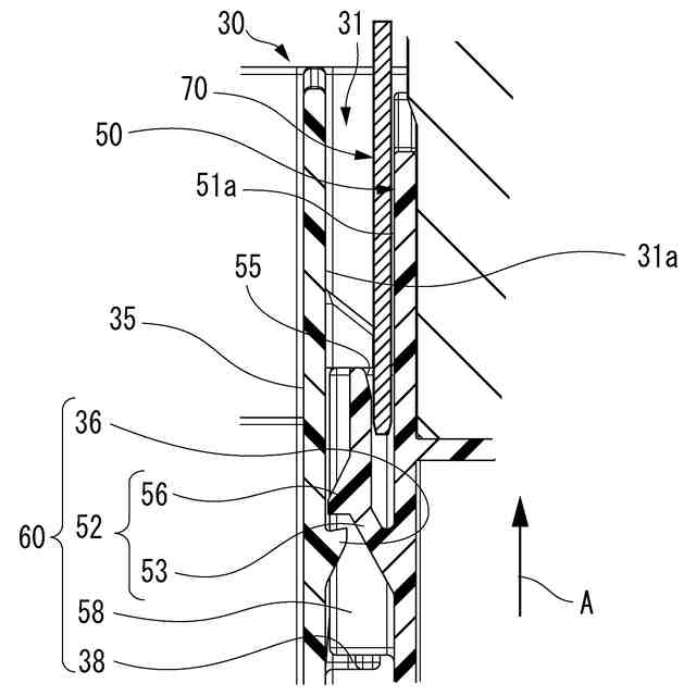 そこで、フレーム530の下部開口から接続体550が挿入されると、フレーム530のロック突起536がロックアーム552の外面を押圧することで、アーム本体553が基部を支持点として内側に撓んで係合凸部556がロック突起536を乗り越えた後、弾性復帰したロックアーム552の係合凸部556をロック突起536が係止する。これにより、接続体550はフレーム530に対して抜け止めされる。