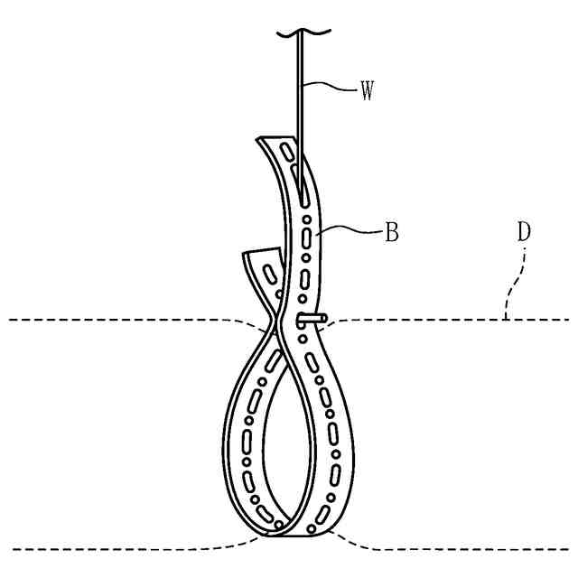 フレキシブルダクトは、例えばワイヤ等の吊具を用い、天井等の構造物から吊り下げる形で設置される。こうしたフレキシブルダクトの設置にあたっては、例えば、昇降台車や高所作業車、あるいは脚立等を用いて作業員が天井付近の高さまで昇りつつ、吊具を取り付けたダクトをその付近まで持ち上げる。前記吊具には、天井に固定するためのプレートが取り付けられており、作業員は、前記プレートを天井における目的の位置に配置し、下から鋲打機(釘打機、ネイルガン等とも)を用いて留具(鋲)を打ち込む。こうして、天井に固定されたプレートから、ワイヤ等の吊具を介して吊り下げられる形でダクトが設置される。