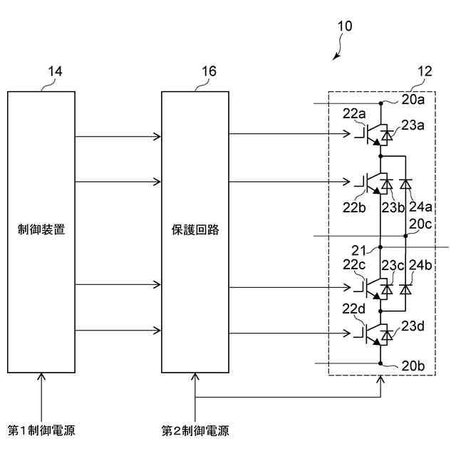 前記保護回路は、前記制御装置に供給される第1制御電源とは異なる第2制御電源の供給を受け、前記第2制御電源に基づいて動作する請求項1記載の電力変換装置。