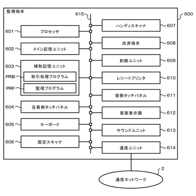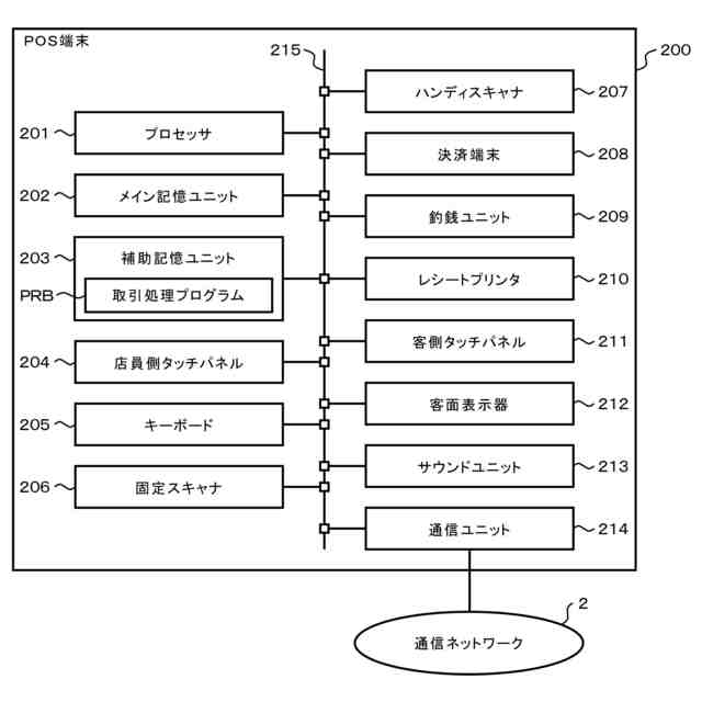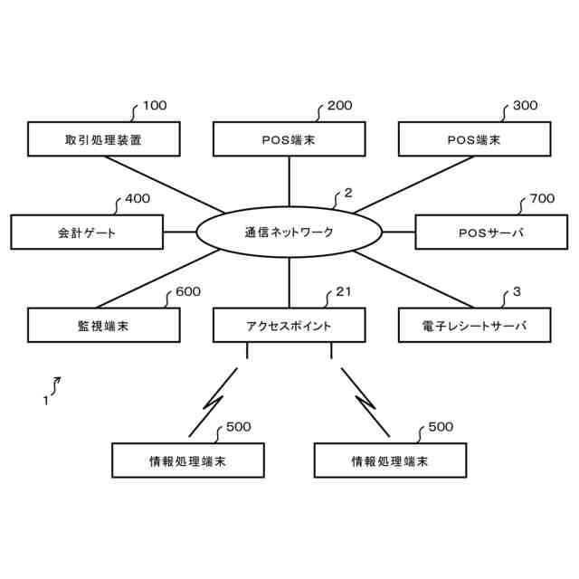 通信ネットワーク2は、インターネット、VPN(virtual private network)、LAN(local area network)、公衆通信網、移動体通信網などを、単独又は適宜に組み合わせて用いることができる。通信ネットワーク2としては、一例として、LAN、インターネット及び移動体通信網が組み合わせて用いられる。取引処理装置100、POS端末200、会計ゲート400、情報処理端末500、監視端末600及びPOSサーバ700の通信には、例えばLANが用いられる。取引処理装置100と情報処理端末500との通信には、例えばLANが用いられる。ただし、情報処理端末500は、通信ネットワーク2に含まれるアクセスポイント21を介した無線アクセスにより通信ネットワーク2に接続される。POS端末200又は会計ゲート400と電子レシートサーバ3との通信には、例えばLAN及びインターネットが用いられる。