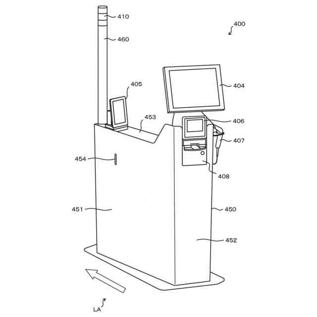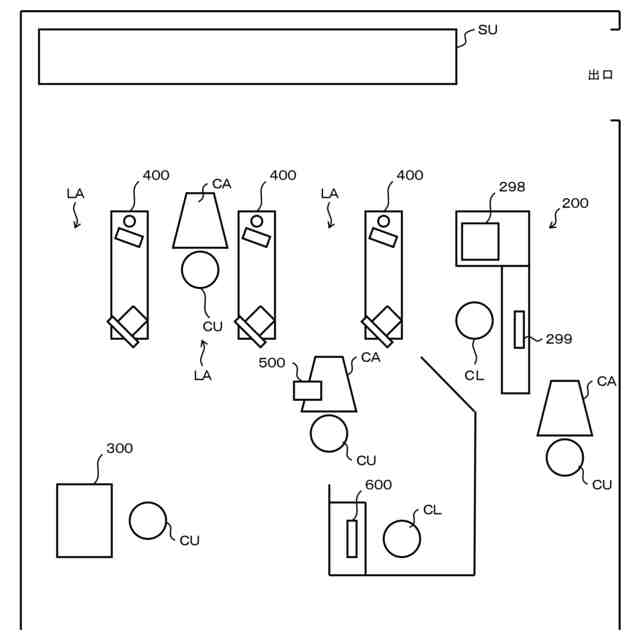 商品販売システムを導入した店舗の会計コーナーのレイアウト例を示す模式図。
