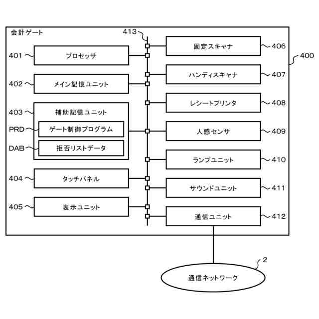 客が店舗から退出する際に通過するチェックアウトレーンに面して設けられたゲート装置と、情報処理装置と、を含み、