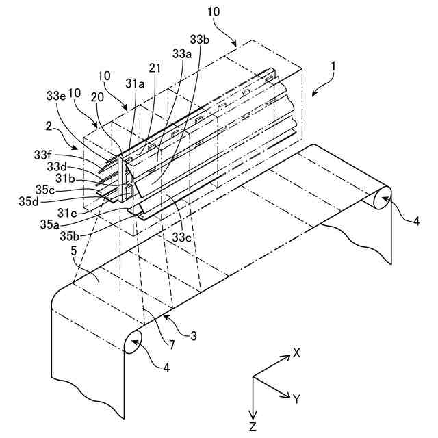 図1に、複数のレーザー光を照射するプロセス装置の一例として、対象物、例えば、二次電池の電極材などを加熱する加熱システムの概要を示している。この加熱システム1は、X方向に加熱対象物3を搬送する搬送装置4と、加熱対象物3の表面(すなわち、照射対象の領域、照射対象の第1の面5)に向けて加熱用のレーザー光7を照射する加熱装置2とを有する。加熱装置2は、複数の光源装置10を含み、それぞれの光源装置10は搬送方向であるX方向に短く、それに直交するY方向に広く、さらに、加熱対象の第1の面5に対して直交するZ方向(すなわち、第1の方向)に延びた仮想軸8に沿って複数のレーザー光源31a~31cが並び、長くなるように配置されている。