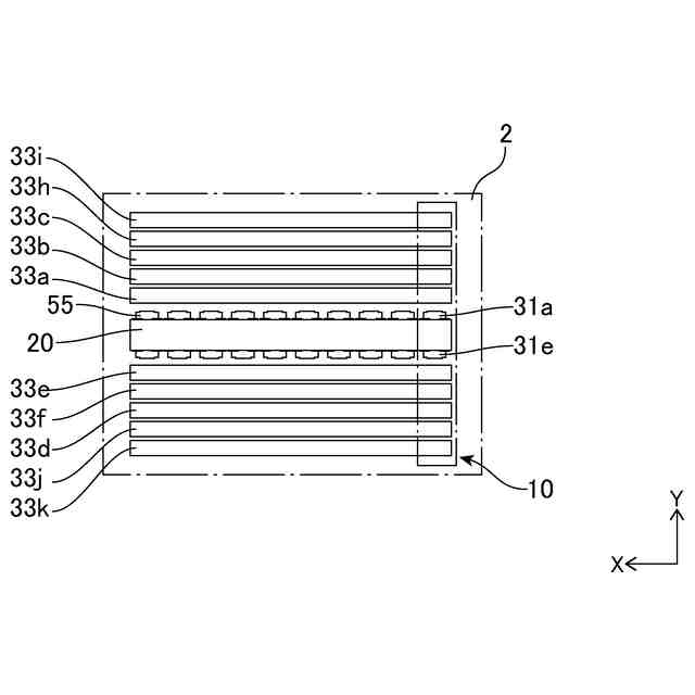 図2に、それぞれの光源装置10の側方(X方向)から見た構成を示している。それぞれの光源装置10は、仮想軸8に沿ってZ方向に延びた放熱基板20と、その一方の支持面(すなわち、第1の支持面)21に、Z方向に仮想軸8に沿って配置された第1のレーザー光源31a、第2のレーザー光源31b、および第3のレーザー光源31cと、反対側の支持面(すなわち、第2の支持面)22に、Z方向に仮想軸8に沿って配置された第4のレーザー光源31d、第5のレーザー光源31e、および第6のレーザー光源31fとを含む。光源装置10は、さらに、Y方向(すなわち、第2の方向)に、第1の支持面21に面して配置された第1反射板33a、第2反射板33b、および第3の反射板33cと、第2の支持面22に面して配置された第4反射板33d、第5反射板33e、および第6の反射板33fとを有する。
