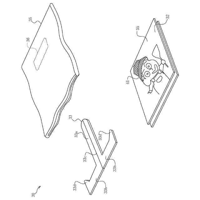 図1に示す物品Pは、平面視で四角形の平板状の副体部40の内側に主体部30が収容された第1形態F1であり、後述する物品供給装置1(図5、図6参照)によって供給することができる。物品Pは、第1形態F1においては、図示のごとく平板形状であるが、第2形態F2(図4参照)においては、後述するように、主体部30が組み立てられた立体物として展示することができる。