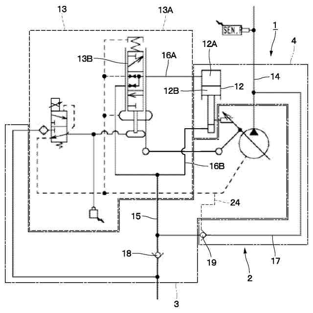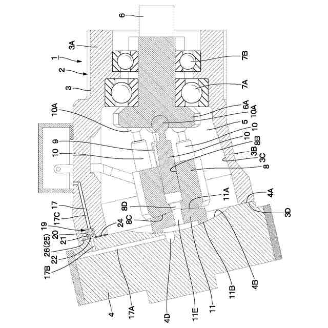 【解決手段】 ポンプケーシング3の端面3Dには、切換油路17の途中に位置してポンプケーシング3の端面3Dに開口して設けられたバルブシート収容室20の開口端とケーシング本体2内のドレン室5とを連通する溝部24を設ける構成としている。これにより、バルブシート収容室20の内面20Bとバルブシート21の筒部21Aとの間から漏れ出た圧油は、溝部24を通じてドレン室5に排出することができる。